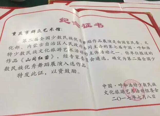 7月8日晚,我市原创女子群舞《山间红苗》精彩亮相由国家民委、文化部、内蒙古自治区人民政府共同主办的第二届全国少数民族优秀舞蹈作品展演,呈现出浓烈的地域风情、独特的苗家魅力和鲜活的巴渝文化吸引力,受到了现场评委和观众的称赞。