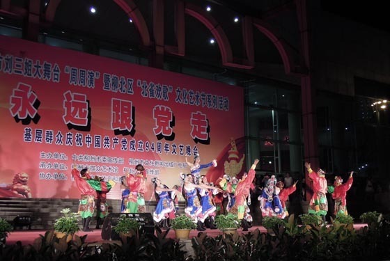 为丰富群众文化生活,打造群众文化活动新品牌,同时也为了纪念中国共产党成立94周年,柳州市柳北区刘三姐大舞台“周周演”暨“北雀欢歌”文化艺术节系列活动“永远跟党走”庆七·一文艺演出2015年6月26日晚20时在柳州市刘三姐大舞台精彩上演。柳州市文新广局、柳州市群众艺术馆、柳北区“和谐文化在基础”系列惠民工程成员单位的领导莅临了演出现场。