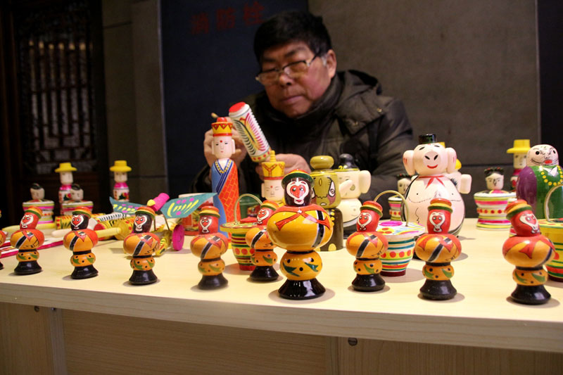 国家级“非遗”项目木旋玩具代表性传承人樊继美现场制作木旋玩具。