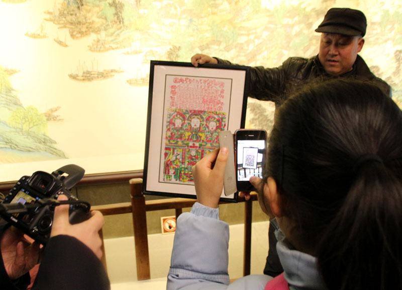 山东省级“非遗”项目木版年画代表性传承人张丙爱向小记者们展示木板年画。