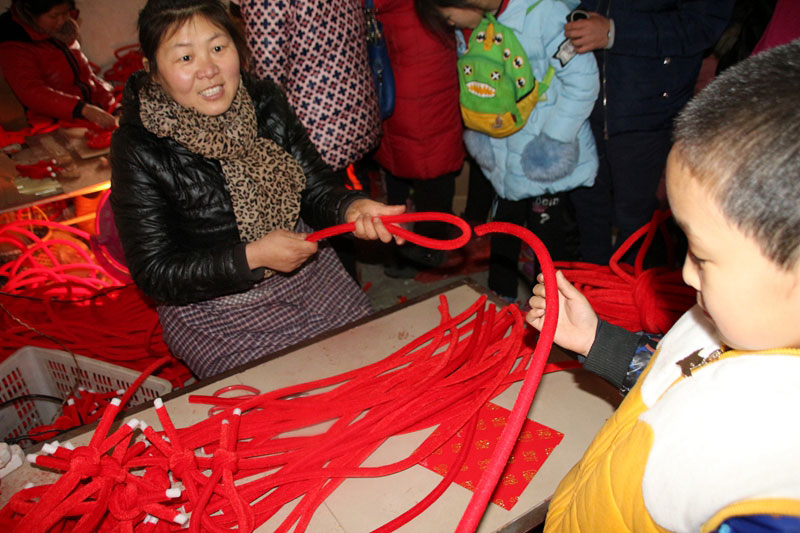 小记者在红花镇前小店子村李祥武的吉祥结艺编织厂里向工人学习制作中国结。