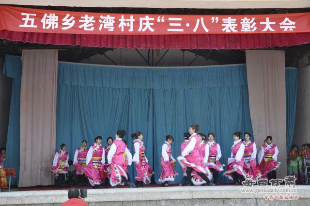 (记者张其文)弘扬家庭美德,培育文明风尚.3月8日,在景泰县五佛乡老湾村举行的庆“三·八”文艺演出暨“好婆婆、好媳妇”表彰大会上。由景泰县文化馆组织的精准扶贫送文化下乡演出团队也前来助兴,并向村民献上了精彩文艺节目。当日,该村对推选出的6位好婆婆和14位好媳妇,分别上台披红授誉领奖,现场的近千名父老乡亲报以热烈的掌声,也受到了启示和教育,同时文艺演出也受到了当地群众的欢迎,掌声连连笑声不断,也让村里的妇女们度过了一个有意义的“三·八”妇女节。
