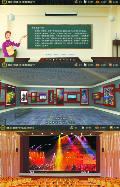 成都市文化馆突破网站平面建设意识,开发线上立体“数字化全景式艺术体验平台”。该平台采用360度全景和三维虚拟技术,将阵地、环境、活动、展览、演出、培训及教学等各项服务移植到互联网,市民进入“http://www.成都市文化馆.com”,就能享受同步、直观、生动的艺术体验。体验平台改变传统网页平面静态展示,通过虚拟空间延伸文化阵地和服务项目: