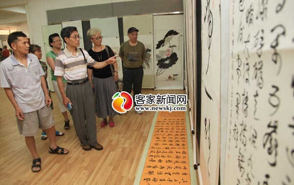 近日,在章贡区文化馆,市民正在欣赏书画作品。为促进老年人书画创作的积极性,展现他们健康向上的精神风貌,由赣州市老年大学学员创作的200余幅书画作品在章贡区文化馆面向社会公众展出。