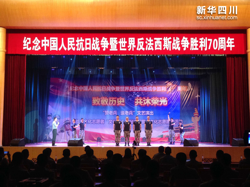 新华网四川频道9月2日电(刘晴 实习生夏颖翀)9月1日,反法西斯战争胜利七十周年纪念日前夕,由成都市文化馆、成都市文化志愿者协会举办的“纪念中国人民抗日战争暨世界反法西斯战争胜利70周年‘致敬历史 共沐荣光’‘赞老兵 送老兵’——成都市文化志愿者“文化暖心驿站进军营”文化志愿服务活动”文艺晚会,在成都军区警卫营温情登场。在场老兵新兵欢聚一堂,欢呼声贯穿全场,气氛十分热烈。