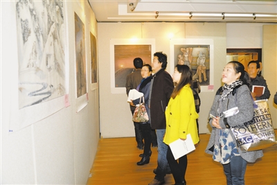 10月27日,“丝路墨韵·彩绘雄关——嘉峪关市中国画油画作品展”在市文化馆开展。市委常委、宣传部部长梁洪涛,副市长常守远参观画展并为获奖者颁奖。图为市民和书画爱好者参观画展。本报记者李多进摄