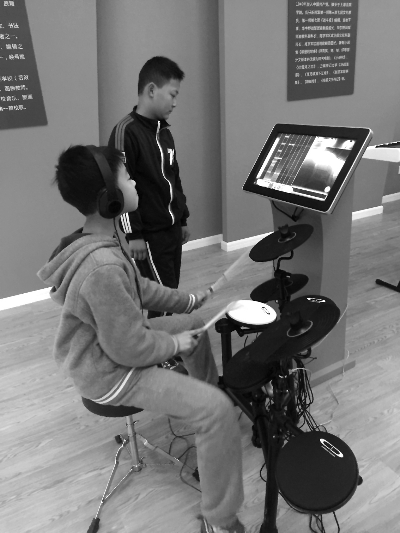 傅天昊正在体验演奏数字架子鼓